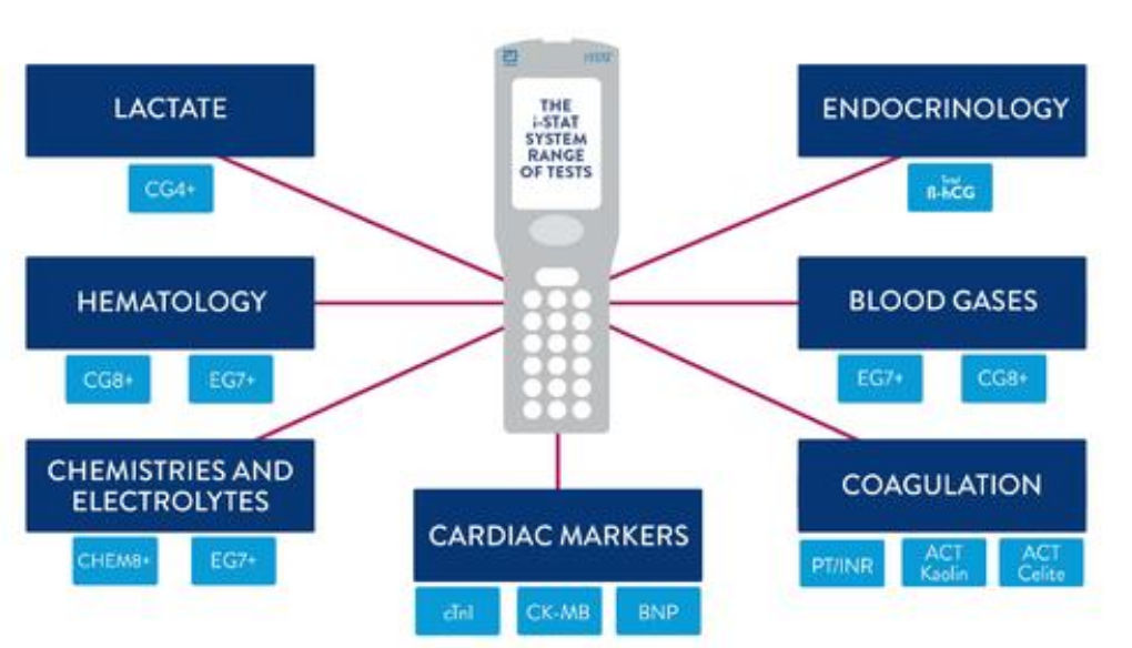 i-STAT System床旁血液監(jiān)護(hù)系統(tǒng)可以幫助臨床醫(yī)生快速多方面了解病人情況,肺/呼吸系統(tǒng):血?dú)?,腎臟:肌酐、尿素氮,心肌:肌鈣蛋白I、B型利鈉肽,體液平衡狀況:血?dú)?電解質(zhì)+乳酸,糖代謝:血糖的檢測,血液:紅細(xì)胞壓積、血色素,凝血功能:凝血酶原時間-國際標(biāo)準(zhǔn)化比值、活化凝血時間。是一個快速、多方面、動態(tài)的網(wǎng)絡(luò)化病情的監(jiān)護(hù)平臺,可以即時獲得準(zhǔn)確檢測結(jié)果。