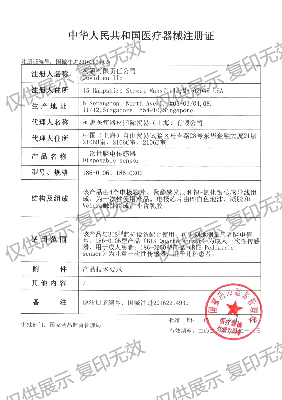 適用范圍:該產(chǎn)品與BISTM監(jiān)護(hù)設(shè)備配合使用,可無創(chuàng)地測(cè)量患者腦電信號(hào)。186-0106型產(chǎn)品(BIS Quatro sensor)為成人一次性傳感器,用于成人患者;186-0200型產(chǎn)品(BIS Pediatric sensor)為兒童一次性傳感器,用于兒科患者。
