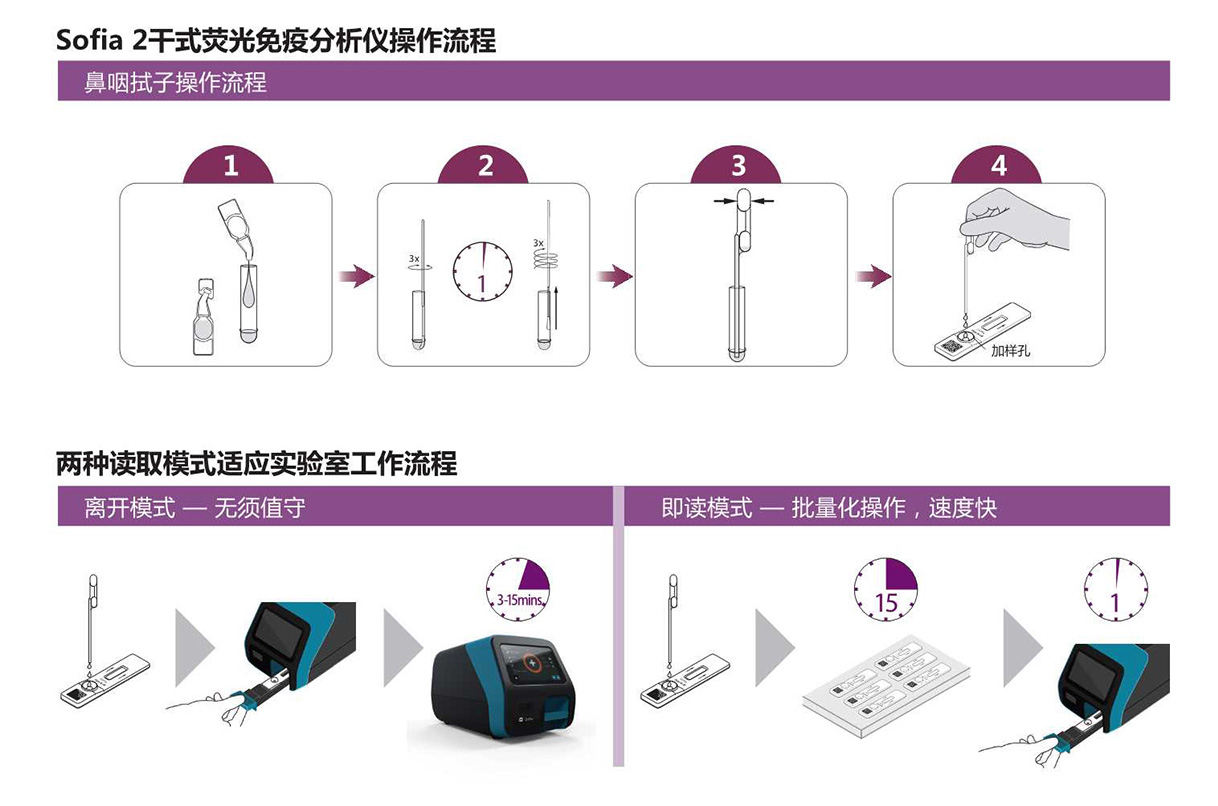 適用范圍:該產(chǎn)品采用免疫熒光法,與配套的檢測(cè)試劑共同使用,在臨床上用于對(duì)來(lái)源于人體的鼻咽拭子樣本進(jìn)行病毒抗原檢測(cè)。